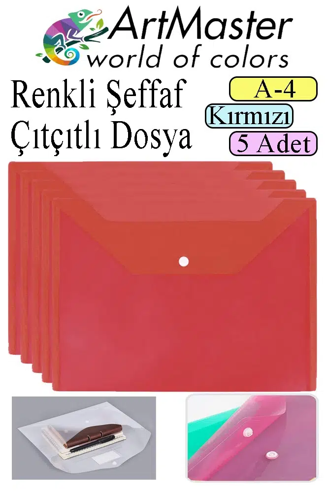 Ürün Adı: Artmaster Kırmızı A4 Çıtçıtlı Dosya Şeffaf Renkli Zarf Dosya 5 Adet Çıt Çıtlı Dosya Su Geçirmez 100 Yaprak Kapasite