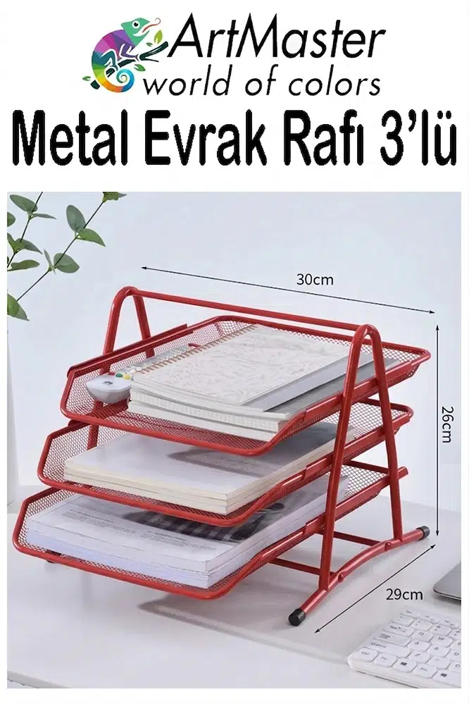 Ürün Adı: Artmaster Kırmızı Metal Evrak Rafı 3 lü 1 Paket Masaüstü A4 Dosya 3 Katlı Düzenleyici Kağıt Tepsisi Metal Fileli Hareketli