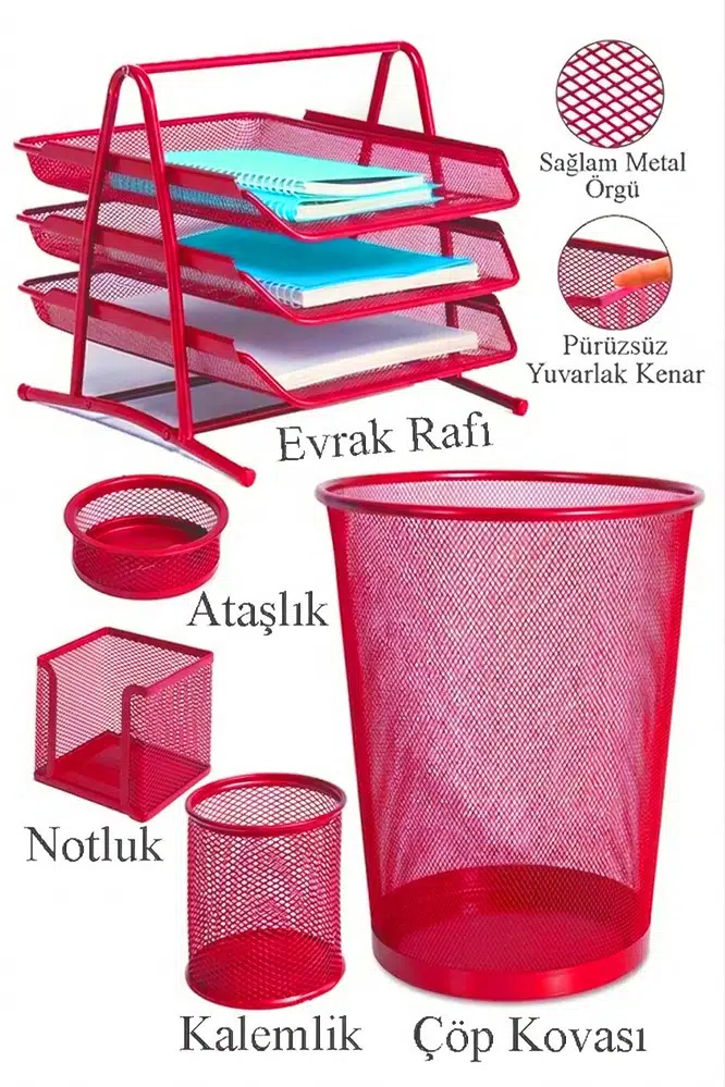 | Etiketler | Kırmızı Metal Evrak Rafı 3 lü Masaüstü Kalemlik 3 lü ve Fileli Çöp Kovası 1 Paket Masaüstü A4 Dosya Düzenleyici Not |