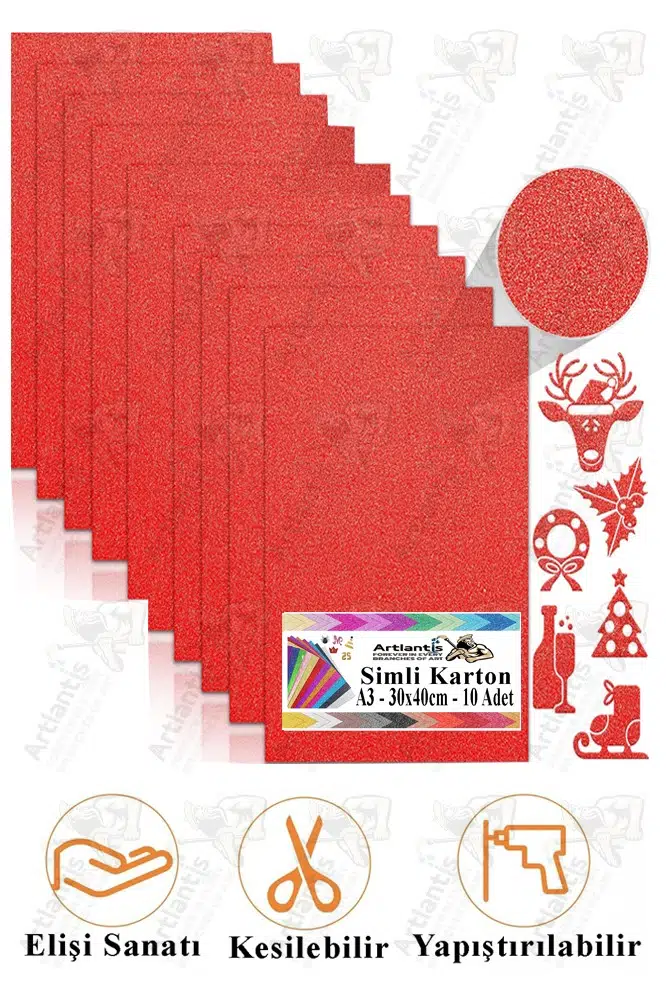 Özel etkinlikler için çelenkler, silindir şapkalar, fotoğraf çerçeveleri, okul dersleri, çeşitli aplikler, restoran yaratıcı menüleri, oturma kartları ve daha fazlası için idealdir.El sanatları için kullanılan sim, parlak renkli simlerle kaplıdır ve parıldayıp parıldadığı için kek süsleri, tebrik kartları, scrapbooking, doğum günü afişleri,| Stok Kodu | ART-A3-SMLFNKRTN-10-KRMZ-1PK |