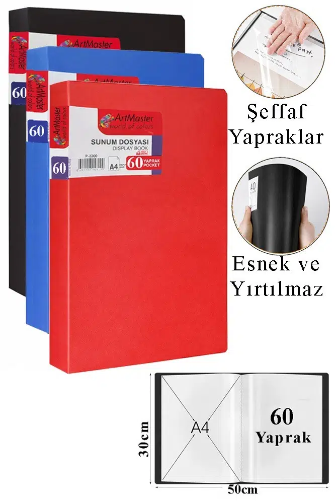 Ürün Adı: Artmaster Kırmızı Siyah Mavi Sunum Dosyası 60 lı 3 Adet Poşet Dosyalı Katalog Dosyası 60 Poşetli Kendinden Dosya Plastik Kapaklı