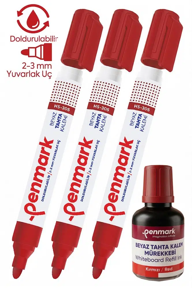 Ürün Adı: Kırmızı Yazı Tahta Kalemi 3 Adet ve Yazı Tahta Mürekkebi 30 ml 1 Adet Doldurulabilir Tahta Kalemi Beyaz Yazı Tahtası
