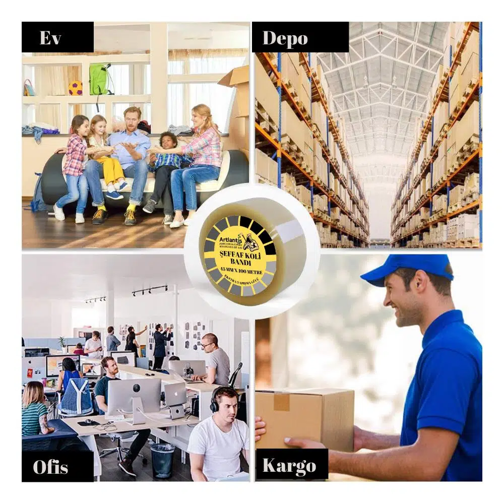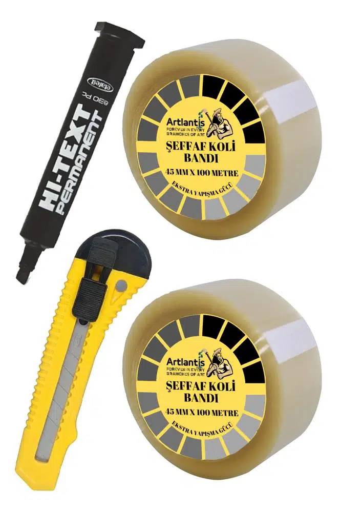 Ürün Adı: Koli Bandı Koli Kalemi ve Maket Bıçağı 1 Paket 2 Adet Koli Bant 100 Metre Şeffaf Kesik Uç Markör Kalem ve Plastik Maket Bıçağı Büyük