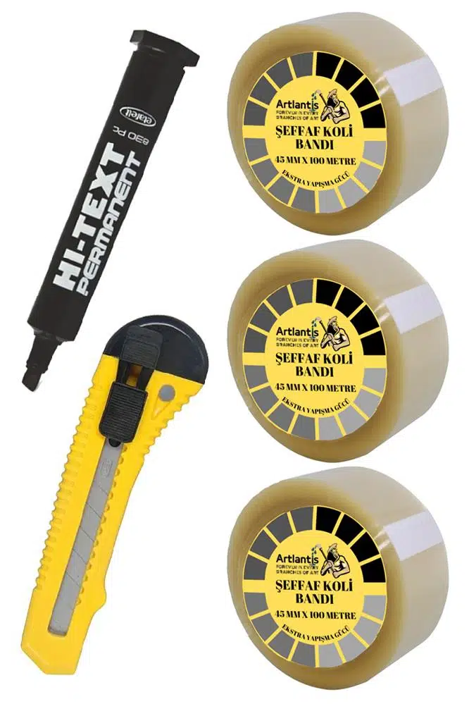 Ürün Adı: Koli Bandı Koli Kalemi ve Maket Bıçağı 1 Paket 3 Adet Koli Bant 100 Metre Şeffaf Kesik Uç Markör Kalem ve Plastik Maket Bıçağı Büyük