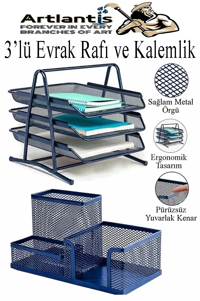 Ürün Adı: Artmaster Lacivert Metal Evrak Rafı 3 lü ve Masaüstü Kalemlik 1 Paket Masaüstü A4 Dosya 3 Katlı Düzenleyici Kağıt Tepsisi Metal