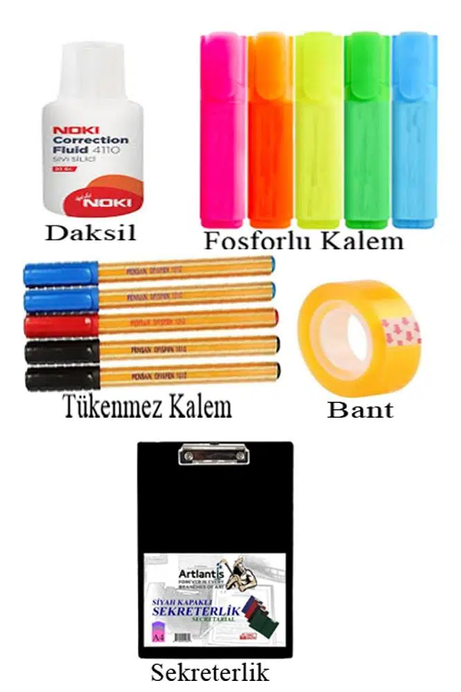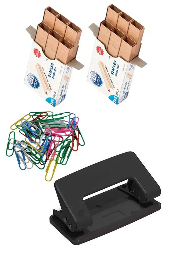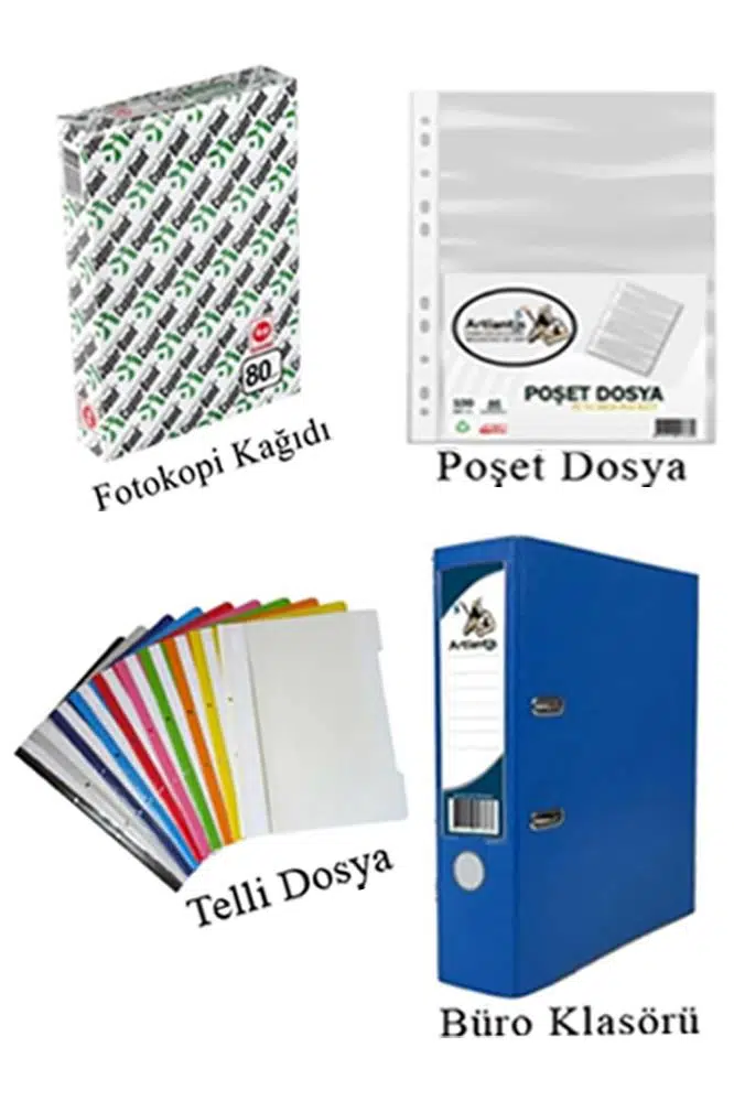 | Etiketler | Masa Üstü Ofis Paketi 18 Parça Fotokopi Kağıdı Metal Evrak Rafı Metal Kalemlik Zımba Makinesi Teli Delegeç Çöp Kovası Küp Notluk |