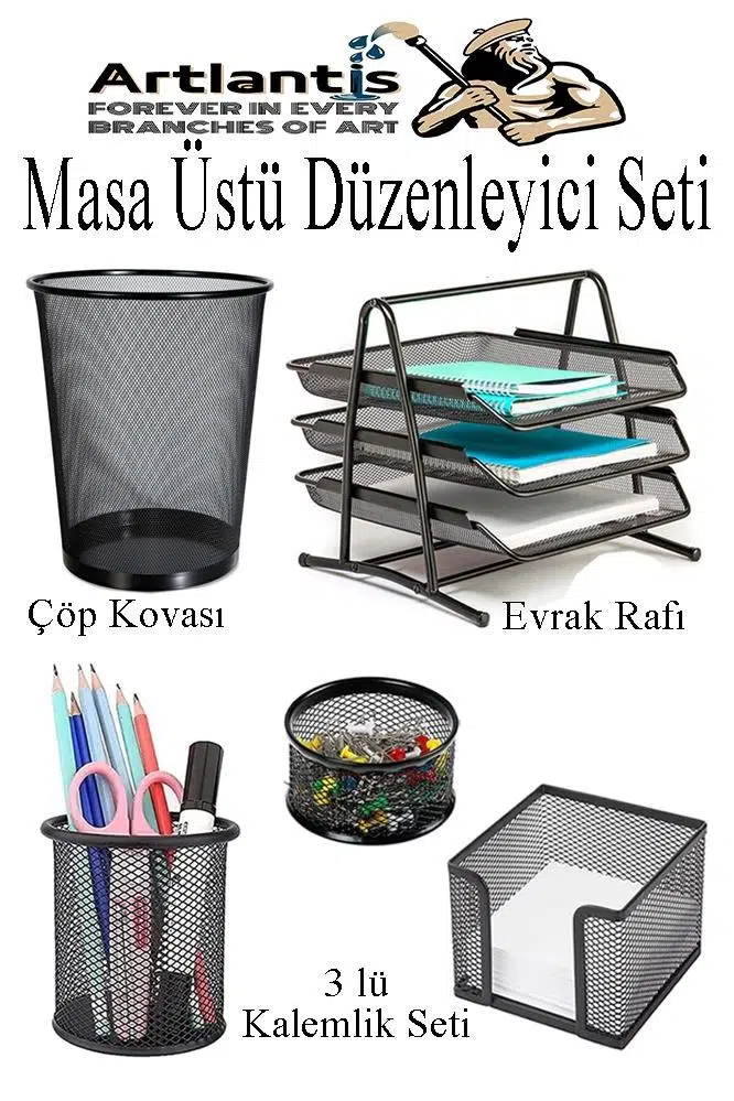 | Etiketler | Masa Üstü Siyah Fileli Kalemlik Çöp Kovası ve 3 Katlı Evrak Rafı 5 Parça 1 Paket 5 li Masa Üstü Düzenleyici Kalemlik Küp Notluk Ataşlık |