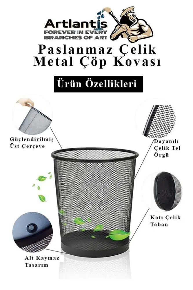 - Metal örgü tasarımı ve boyalı kaplaması ile çöp kutusu sağlam ve pratiktir, bükülmesi ve paslanması kolay değildir.