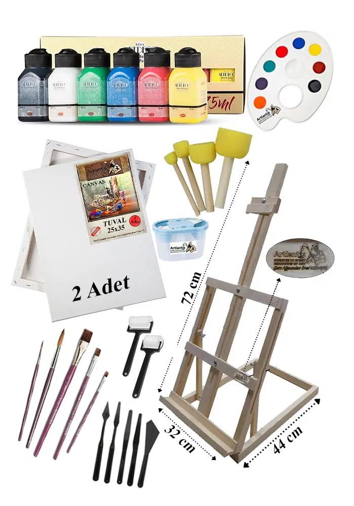 Masa Üstü Şövale Akrilik Boya Resim Seti Artdeco 6 Renk 75 ml Akrilik Boya 2 Tuval 25x35 Fırça Spatula Ponpon Rulo Sünger