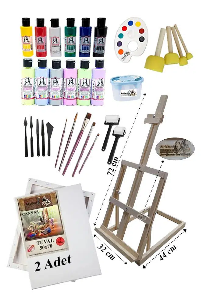 Masa Üstü Şövale Akrilik Boya Resim Seti Monalisa 12 Renk 70 ml Akrilik Boya 2 Tuval 50x70 Fırça Spatula Ponpon Rulo Sünger