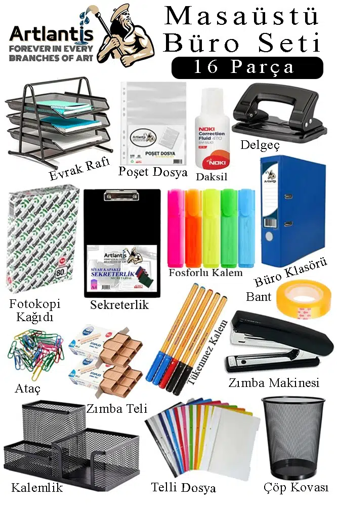 | Etiketler | Masaüstü Büro Seti 16 Parça Siyah Metal Evrak Rafı Kalemlik 3 lü Zımba Makinesi Delegeç Çöp Kovası Ataşlık Notluk |