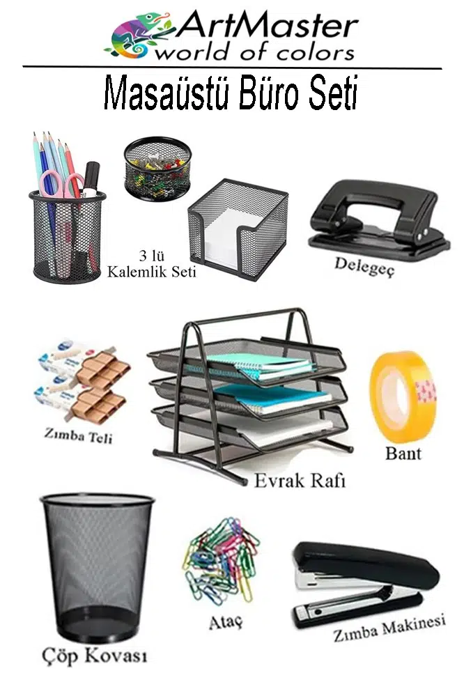 Ürün Adı: Artmaster Masaüstü Büro Seti Metal Siyah 8 Parça Kalemlik Evrak Rafı 3 Lü Delgeç Zımba Makinesi Notluk Çöp Kovası Ataç