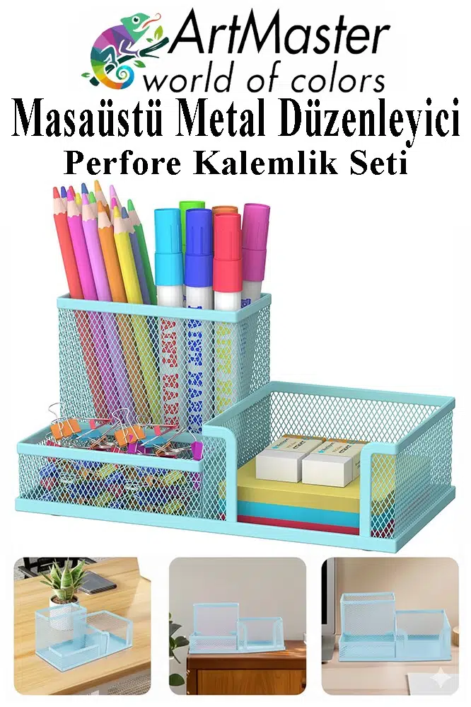 Ürün Adı: Masaüstü Metal Kalemlik Seti 3 lü Kombo Açık Mavi 1 Paket Fileli Perfore Kalemlik Kağıtlık Küpnotluk Düzenleyici Ataşlık