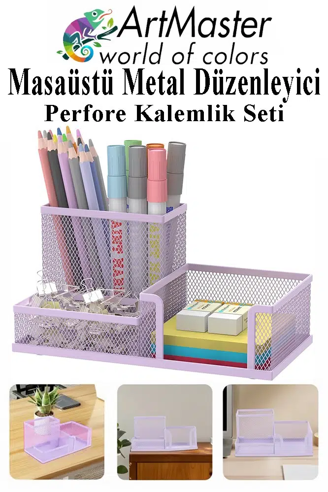 Ürün Adı: Masaüstü Metal Kalemlik Seti 3 lü Kombo Lila 1 Paket Fileli Perfore Kalemlik Kağıtlık Küpnotluk Düzenleyici Ataşlık