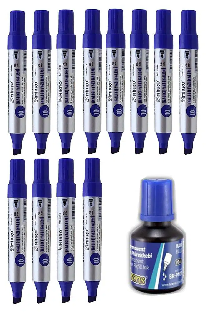 Ürün Adı: Mavi 10 mm Kesik Uçlu Markör Permanent Kalem 12 Adet ve Mavi Mürekkep 1 Adet Çuval Koli Kalemi