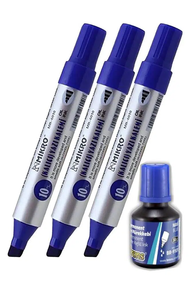 | Etiketler | Mavi 10 mm Kesik Uçlu Markör Permanent Kalem 3 Adet ve Mavi Mürekkep 1 Adet Çuval Koli Kalemi |