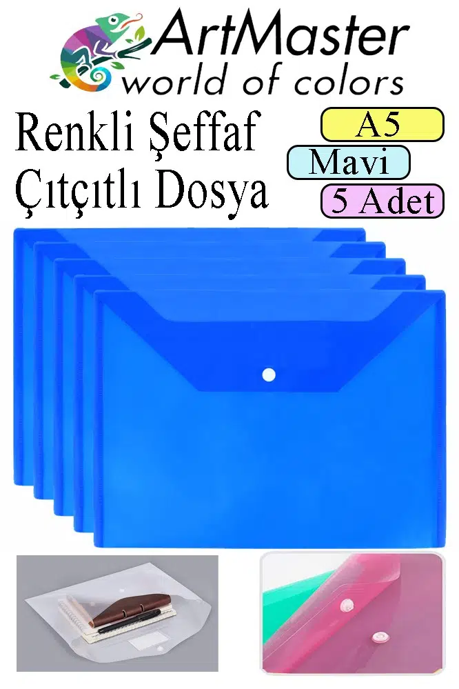Ürün Adı: Artmaster Mavi A5 Çıtçıtlı Dosya Şeffaf Renkli Zarf Dosya 5 Adet 17x22 cm Çıt Çıtlı Dosya Su Geçirmez 50 Yaprak Kapasiteli