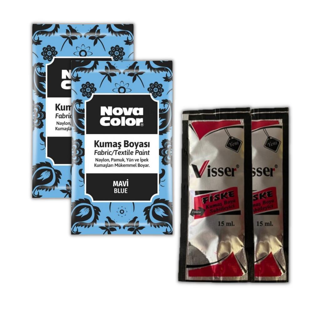 Ürün Adı: Nova Color Mavi toz kumaş boyası 12 gr 2 adet Visser Kumaş Sabitleyici Fiske 15 ml 2 adet