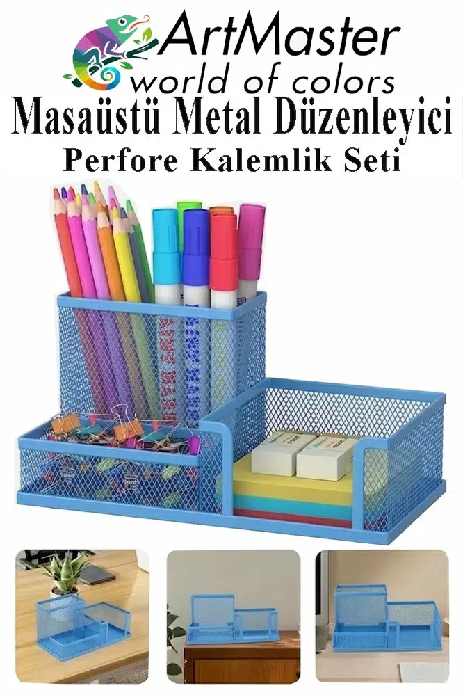 Ürün Adı: Artmaster Mavi Masaüstü Metal Kalemlik Seti 3 lü Kombo 1 Paket Fileli Perfore Renkli Kalemlik Kağıtlık Küpnotluk Düzenleyici