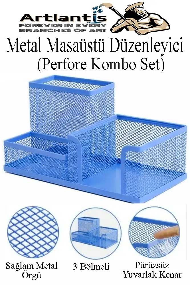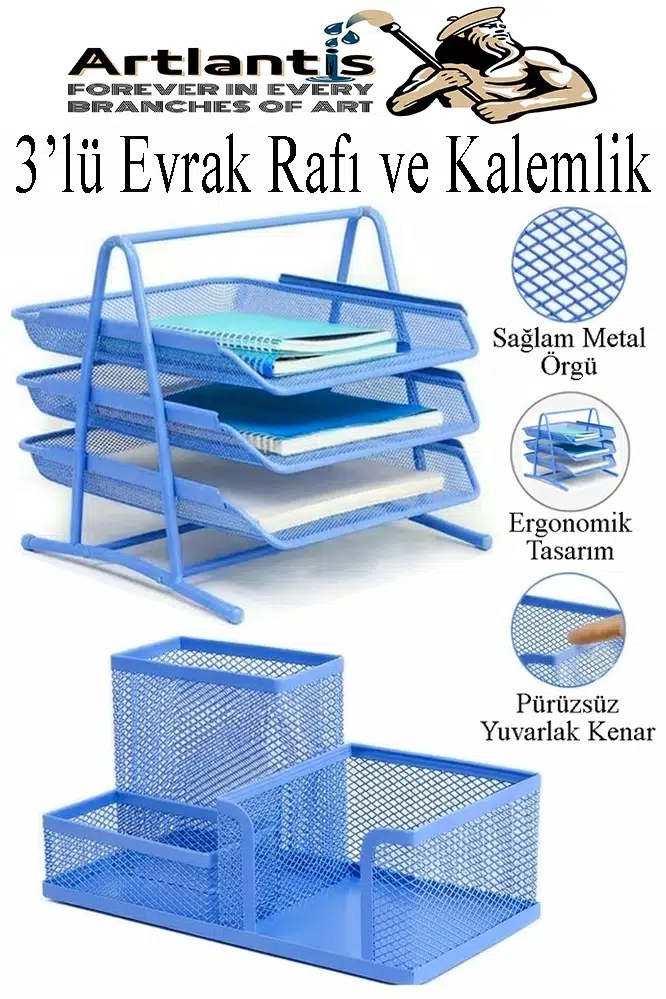 Ürün Adı: Artlantis Mavi Metal Evrak Rafı 3 lü ve Masaüstü Kalemlik 1 Paket Masaüstü A4 Dosya 3 Katlı Düzenleyici Kağıt Tepsisi Metal