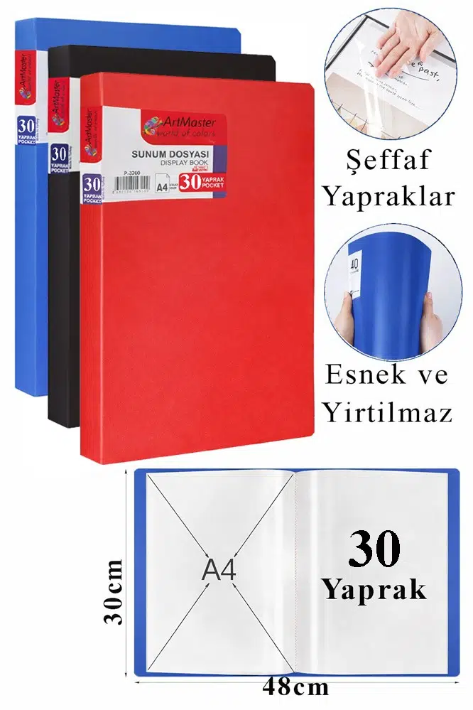 Ürün Adı: Artmaster Mavi Siyah Kırmızı Sunum Dosyası 30 lu 3 Adet Poşet Dosyalı Katalog Dosyası 30 Poşetli Kendinden Dosya Plastik Kapaklı