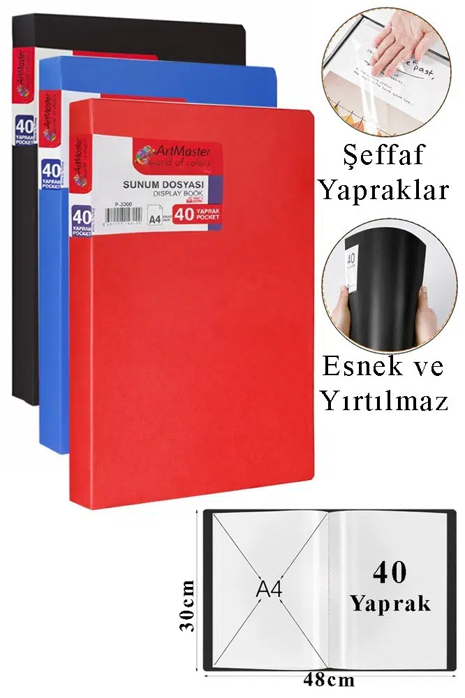 Ürün Adı: Artmaster Mavi Siyah Kırmızı Sunum Dosyası 40 lı 3 Adet Poşet Dosyalı Katalog Dosyası 40 Poşetli Kendinden Dosya Plastik Kapaklı