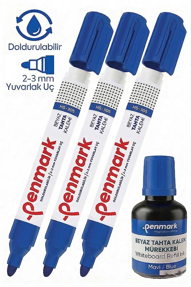 Ürün Adı: Mavi Yazı Tahta Kalemi 3 Adet ve Yazı Tahta Mürekkebi 30 ml 1 Adet Doldurulabilir Tahta Kalemi Beyaz Yazı Tahtası