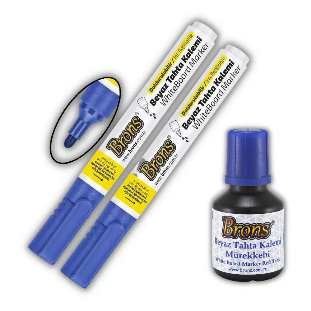 Ürün Adı: Brons Mavi Yazı Tahta Kalemi Doldurulabilir 2 Adet ve Silinebilir Mürekkep 30 ml 1 Adet Brons Yazı Tahta Kalem Seti