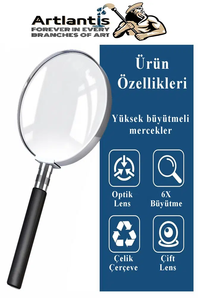- 6 kat net büyütme etkisine sahip siyah büyüteç, uygun boyutu ve kalınlığı, okunması ve taşınması kolay Bu büyüteç bilimsel alet değildir, lütfen kullandığınızda gözlem nesnesinden çok uzak olmayın, en uygun görsel mesafe 3-5 cm'dir, bu nedenle lütfen büyüteci ve nesneyi saklayın. 5 cm'lik gözlem mesafesiBüyütecin düşmesini ve kırılmasını önlemek için büyütecin sapı ve merceğin kenarı krom metalden yapılmıştır; Lens, iyi büyütme etkisine sahip, sağlam ve dayanıklı pleksiglastan yapılmıştır
