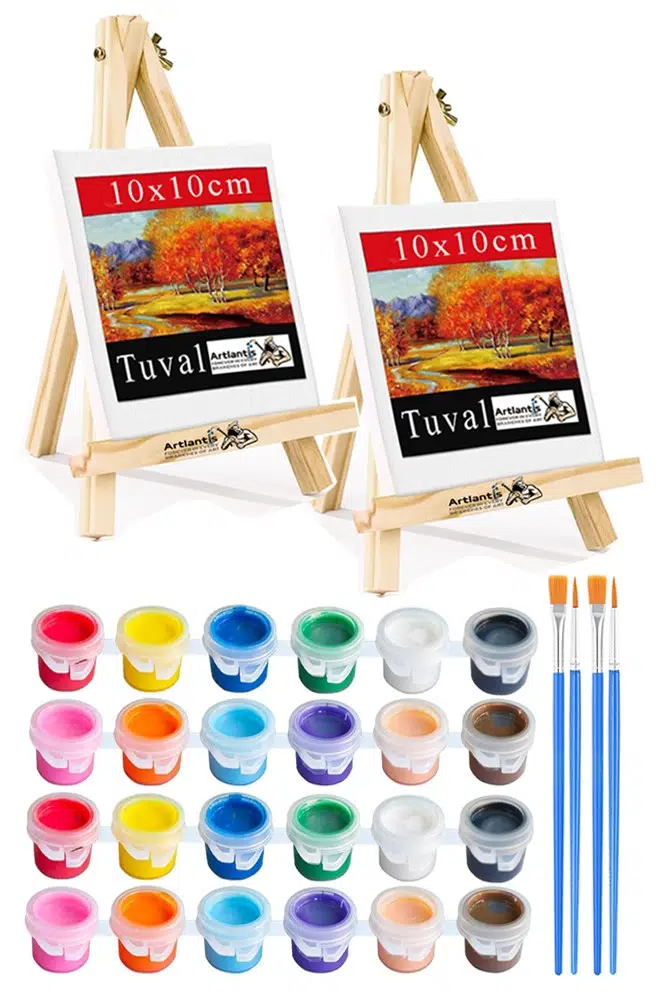 Ürün Adı: Mini Şövale 10x10 cm Tuval 3 ml Akrilik Boya 12 Renk ve Fırça 2 Adet 10x10 Mini Tuval Masaüstü Küçük Şövale Boyama Seti