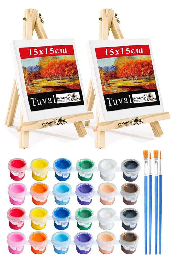 Ürün Adı: Mini Şövale 15x15 cm Tuval 3 ml Akrilik Boya 12 Renk ve Fırça 2 Adet 15x15 Mini Tuval Masaüstü Küçük Şövale Boyama Seti