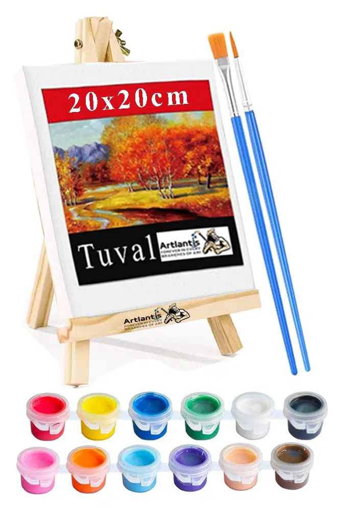 Ürün Adı: Mini Şövale 20x20 cm Tuval 3 ml Akrilik Boya 12 Renk ve Fırça 1 Paket 20x20 Mini Tuval Masaüstü Küçük Şövale Boyama Seti