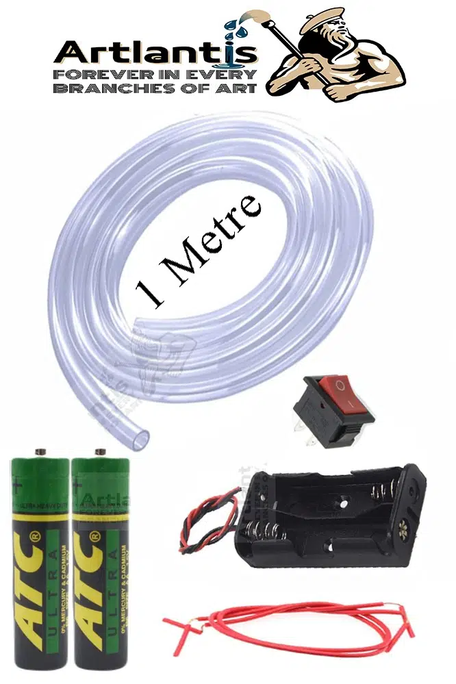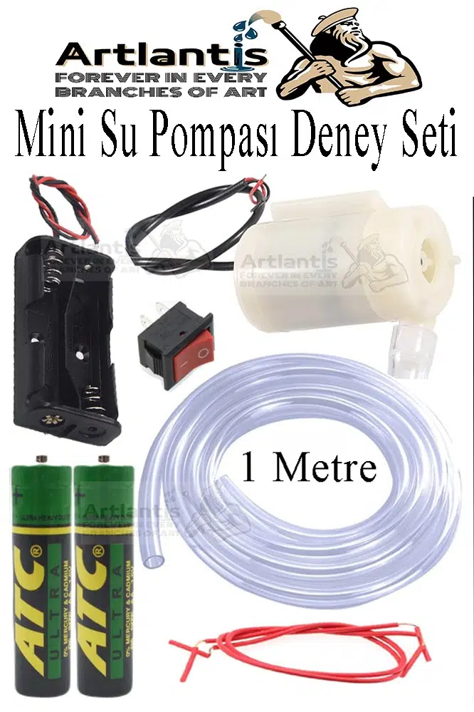 Mini Su pompası 1 adet şeffaf hortum 1 metre 1 adet pil yatağı 2 li 1 adet 1.5 volt pil 2 adet deney anahtarı 1 adet deney kablosu 1 adet