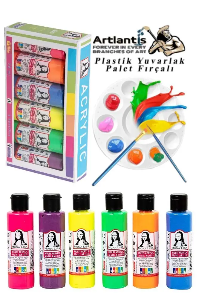 Ürün Adı: Monalisa Akrilik Boya 6 Renk x 70 ml Fosforlu Neon Renkler 1 Paket ve Yuvarlak Resim Paleti Fırçalı 1 Paket 10 Hazneli Boya Paleti Sanatsal Boyalar İçin Palet Akrilik Boya