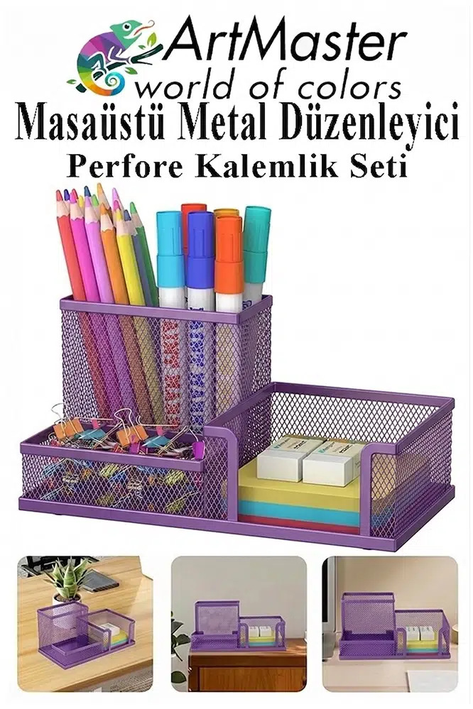 Ürün Adı: Artmaster Mor Masaüstü Metal Kalemlik Seti 3 lü Kombo 1 Paket Fileli Perfore Renkli Kalemlik Kağıtlık Küpnotluk Düzenleyici