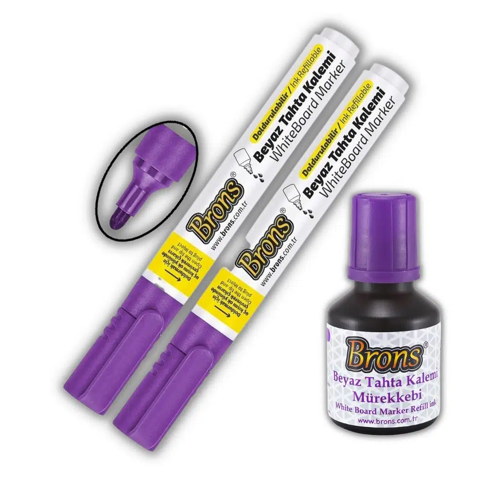 Ürün Adı: Brons Mor Yazı Tahta Kalemi Doldurulabilir 2 Adet ve Silinebilir Mürekkep 30 ml 1 Adet Brons Yazı Tahta Kalem Seti