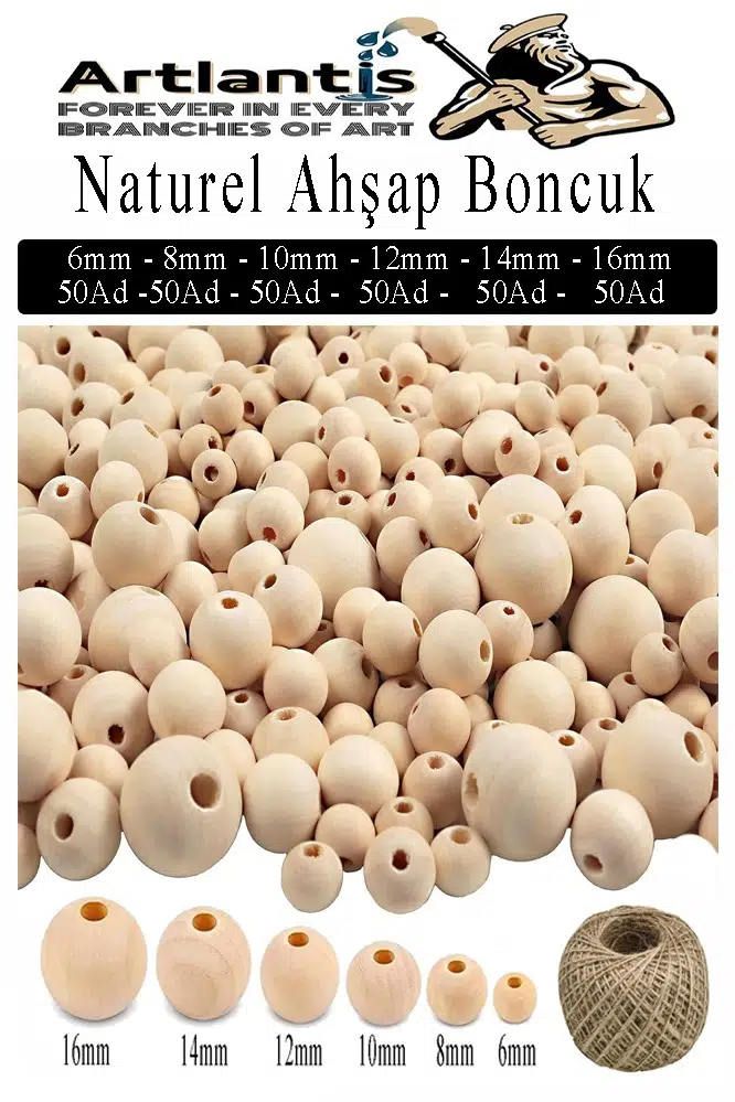 Ürün Adı: Naturel Ahşap Boncuk 300 lü 1 Paket Jüt İpi Ham Boyanabilir Ahşap Yuvarlak Doğal Boncuklar Takı Tasarım Ektinlik Kreş