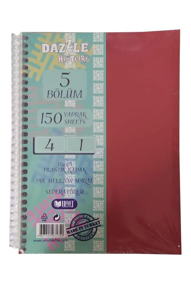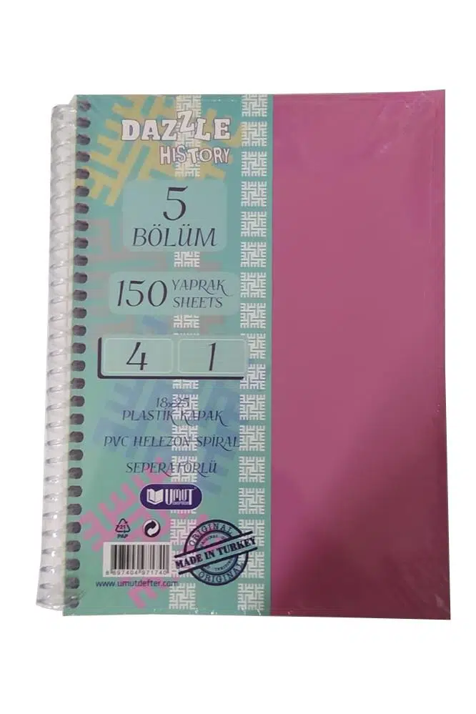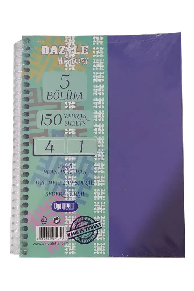 Ürün Adı: Orta Boy 4+1 Ayraçlı Defter 5 Konulu 150 Yaprak 1 Adet 4 Kareli 1 Çizgili Spralli Plastik Kapak Seperatörlü 18x25 cm