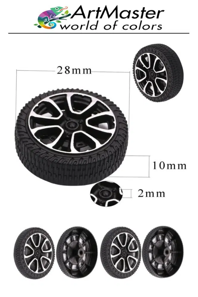 -Tekerlek çapı 28 mm'dir. Kalınlık 9 mm'dir. İç delik 2 mm şafta uyar; Küçük araba kamyon projeleri için mükemmeldir Yüksek kaliteli, dayanıklı malzeme Paket 4 adet tekerlek içerir.