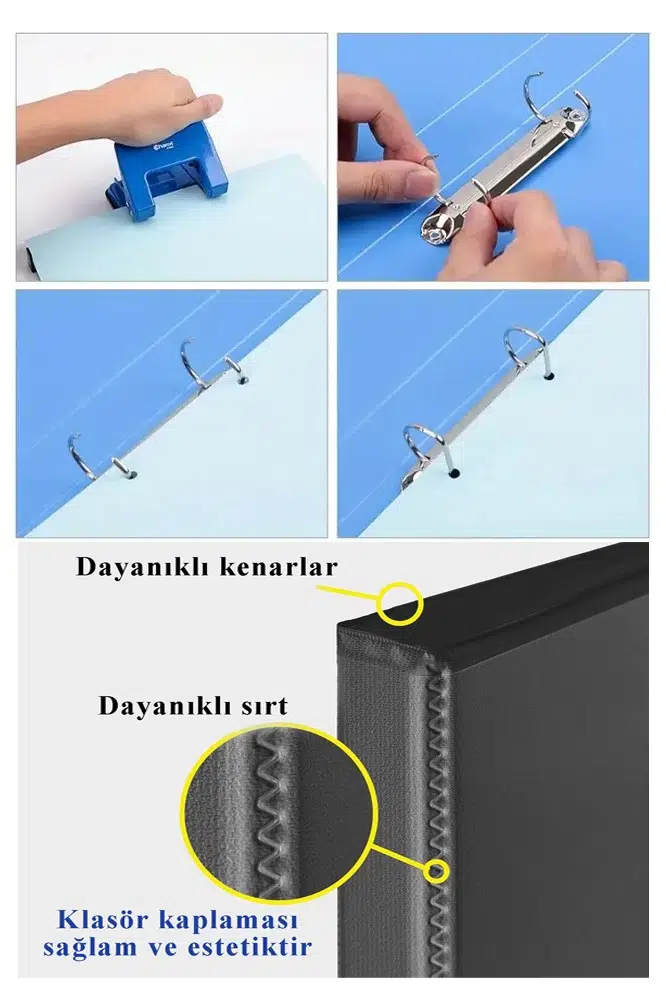 - 3 cm 4 yuvarlak halkalı klasör, 200 sayfalık a4 boyutunda belgeleri veya 4 delikli poşet dosya tutar.Ev/Okul Kullanımı İçin: Ev evraklarını, önemli belgeleri, vergi belgelerini ve sınıf projelerini düzenlemek için bir set olarak kullanmak için harikadır.Pvc kaplamalı 4 halkalı klasörü, dayanıklı kenar ve sırt yapıştıması ile dayanıklıdır