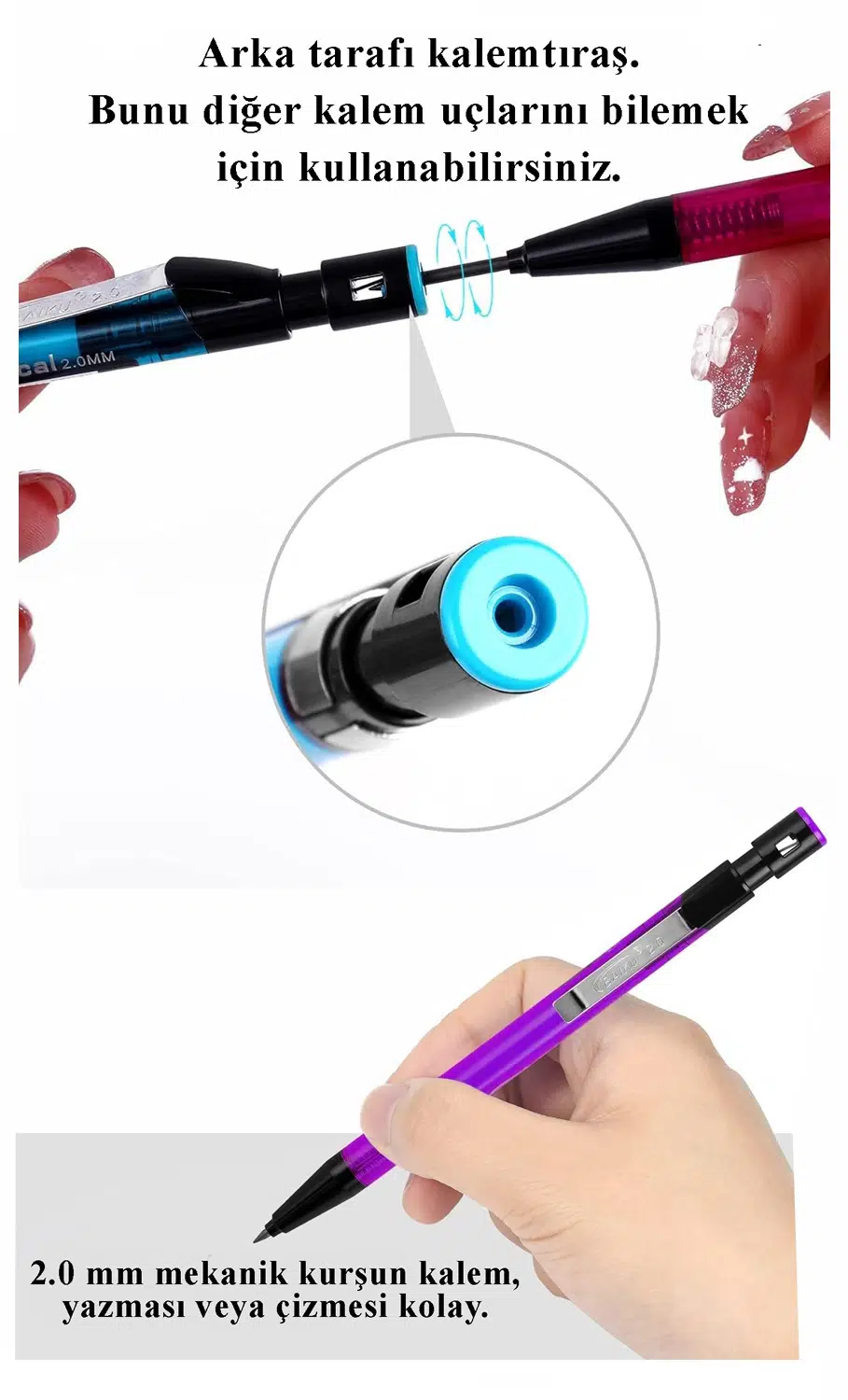 Mekanik kalemin kapağındaki bir kalemtıraş ile uç dolguları kolayca bileyebilirsiniz.