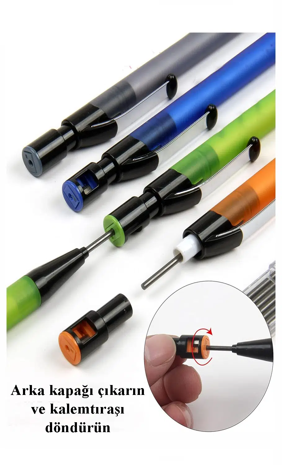Mekanik kalemin kapağındaki bir kalemtıraş ile uç dolguları kolayca bileyebilirsiniz.