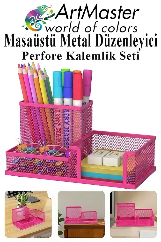 Ürün Adı: Artmaster Pembe Masaüstü Metal Kalemlik Seti 3 lü Kombo 1 Paket Fileli Perfore Renkli Kalemlik Kağıtlık Küpnotluk Düzenleyici