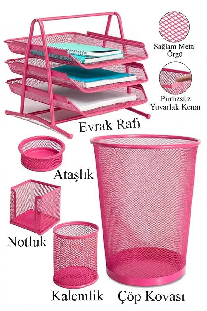 | Etiketler | Pembe Metal Evrak Rafı 3 lü Masaüstü Kalemlik 3 lü ve Fileli Çöp Kovası 1 Paket Masaüstü A4 Dosya Düzenleyici Notluk |