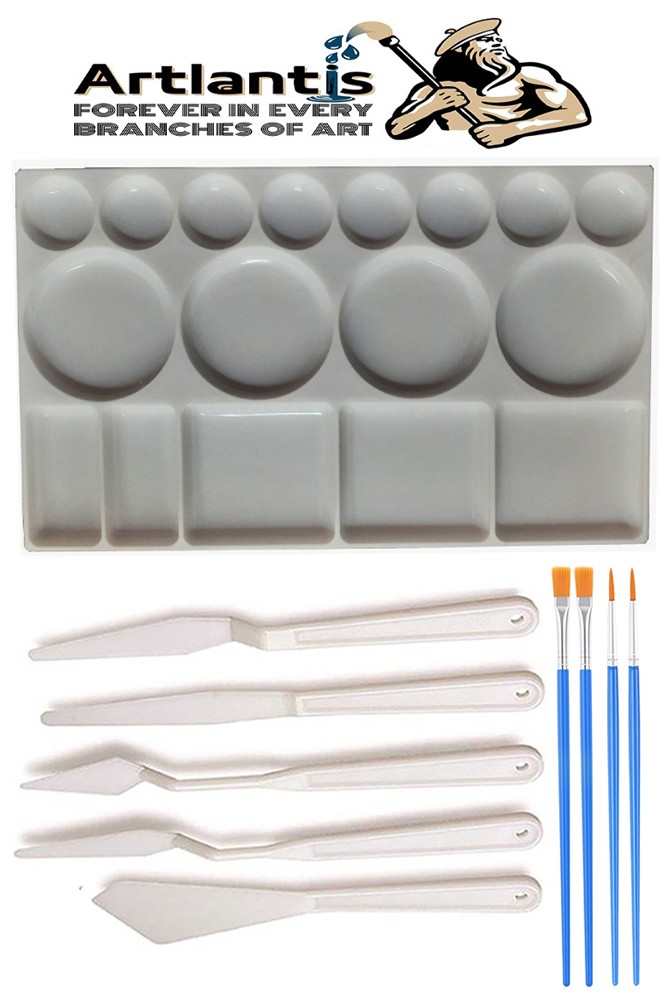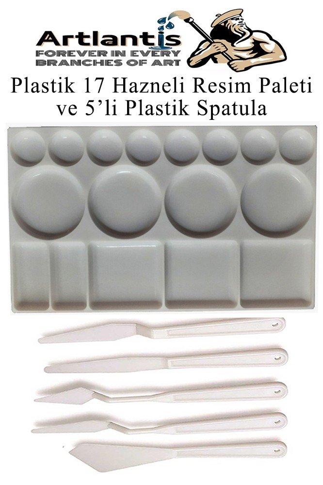 Ürün Adı: Plastik Masa Üstü 17 Hazneli Resim Paleti 5 li Plastik Spatula ve Resim Fırçası 1 Paket Ressam Sanatsal Palet Bıçağı