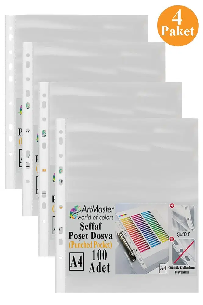 Ürün Adı: Artmaster Poşet Dosya 100 Lü A-4 Şeffaf Föy Dosya 4 Paket Artmaster Ofis Okul Kenarı Delikli Poşet Dosya 80 Sayfa Kapasiteli
