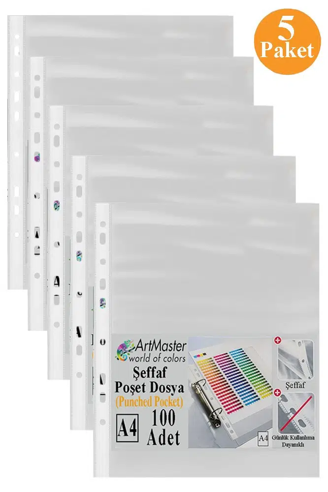 Ürün Adı: Artmaster Poşet Dosya 100 Lü A-4 Şeffaf Föy Dosya 5 Paket Artmaster Ofis Okul Kenarı Delikli Poşet Dosya 80 Sayfa Kapasiteli