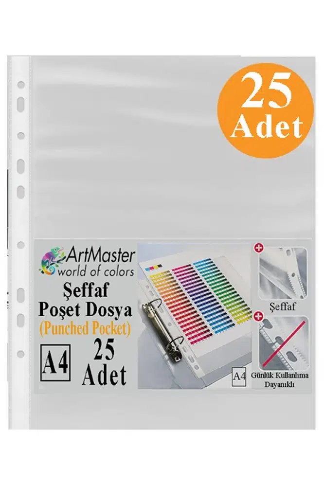 Ürün Adı: Artmaster Poşet Dosya 25 Li A-4 Şeffaf Föy Dosya 1 Paket Artmaster Ofis Okul Kenarı Delikli Poşet Dosya 80 Sayfa Kapasiteli