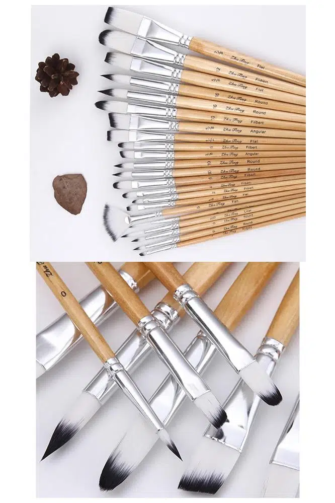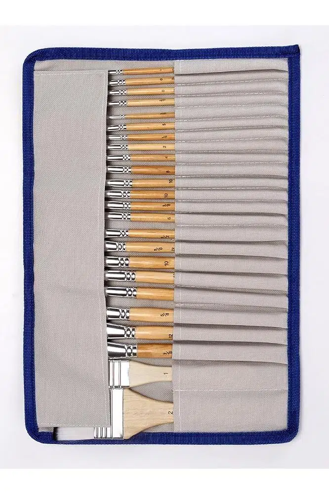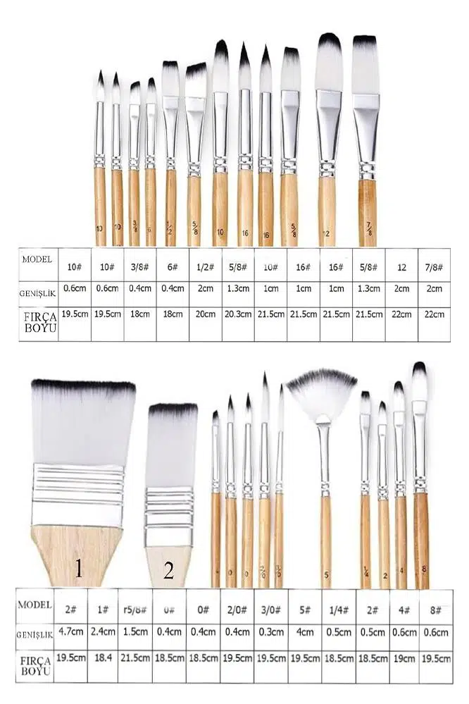 Geniş-(1#, 2#), Açısal-(5/8#, 3/8#, 1/2#, 5/ dahil olmak üzere farklı boyama ihtiyaçlarını karşılayabilen 24 adet farklı şekil ve boyutta boya fırçası 8#), Düz-(1/4#, 1/2#, 5/8#, 7/8#), Yuvarlak- (2 adet 0#, 2 adet 10#, 2 adet 16#,), Fındık-( 2# , 4#, 6#, 8#, 10#, 12#) , Astar-(2/0#, 3/0).