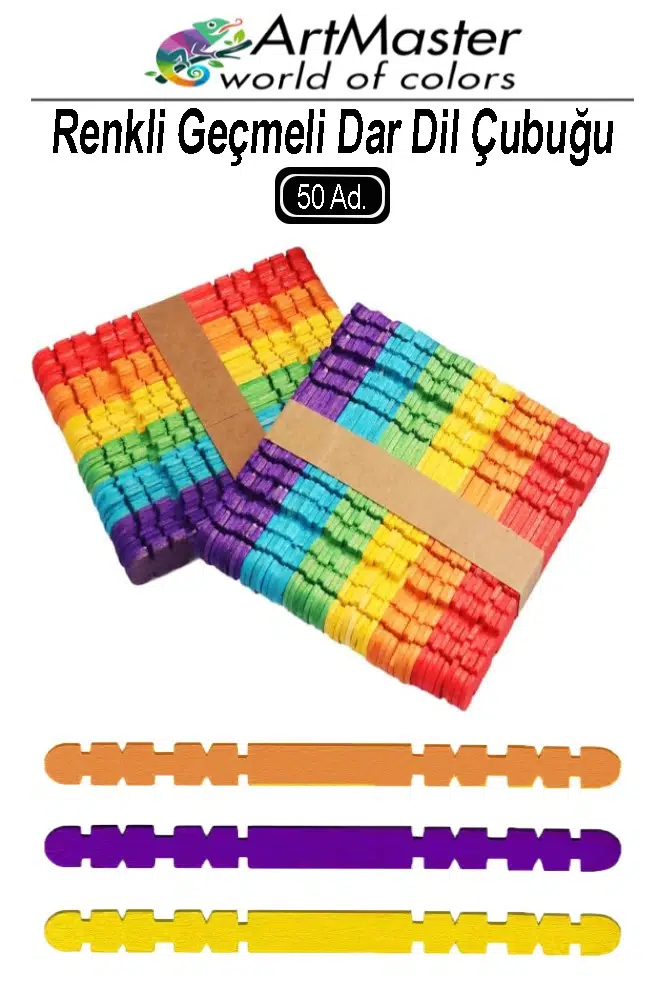 Ürün Adı: Renkli Dil Çubuğu Geçmeli Dar 50 Li 1 Paket Ahşap Çubuk Çentikli Eklemeli Renkli Tırtıklı Dondurma Çubuğu
